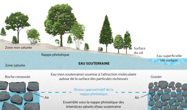 L’eau qui s’infiltre initialement dans le sous-sol va dans une zone non saturée ou va où l’air se mêle à l’eau. Une partie de l’eau sera absorbée par les racines ou affleurera, mais le reste gagnera la zone saturée, c’est‑à-dire toute la région sous le niveau hydrostatique, contribuant ainsi à la recharge des aquifères locaux.